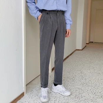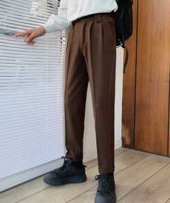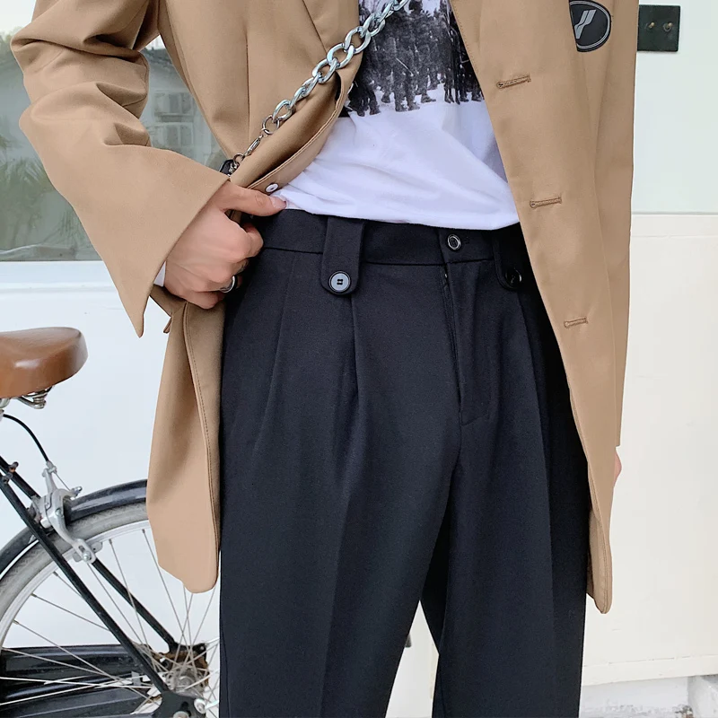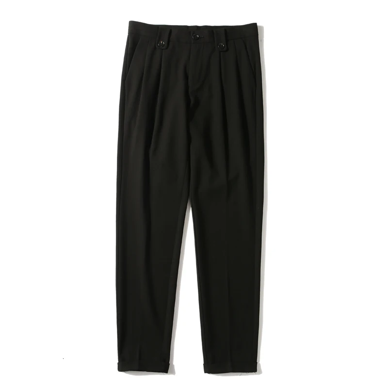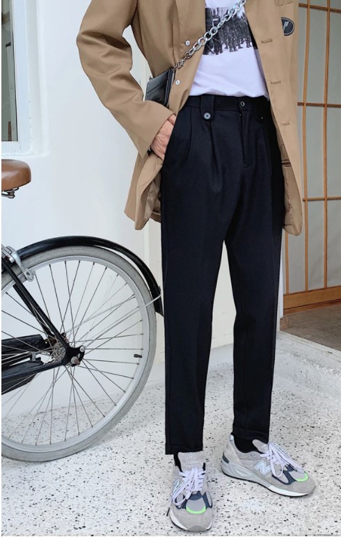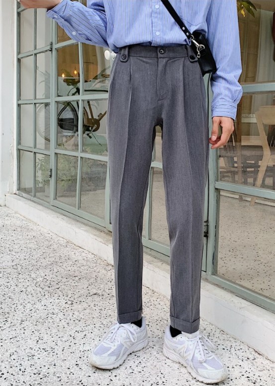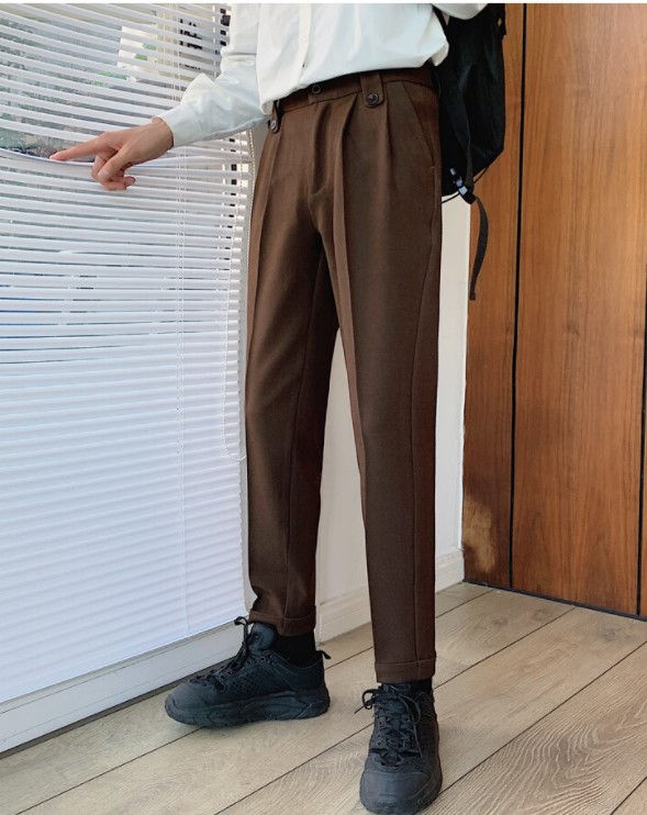 -casual paints with solid color, multi-pleats at waist and belt loops