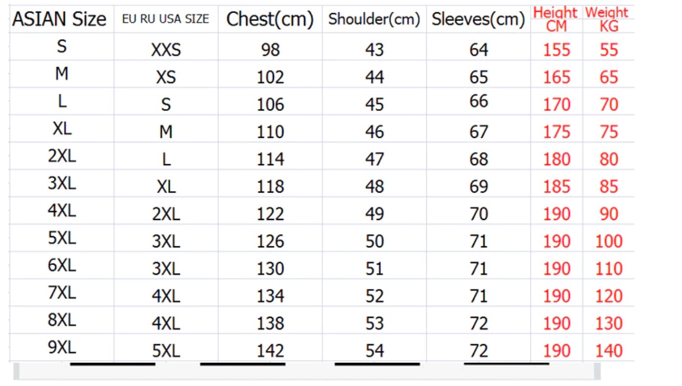 | Euro vs Asian Size | Asian Size is about 3 sizes smaller than US / EU e.g. if you are American size M => should then choose Asian size XXL or vice versa., When measuring by hands, differences within 3 cm might happen (1 inch = 2.54 cm). |