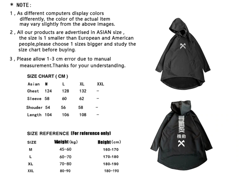 Euro vs Asian Size | Asian Size is about 3 sizes smaller than US / EU e.g. if you are American size M => should then choose Asian size XXL or vice versa., When measuring by hands, differences within 3 cm might happen (1 inch = 2.54 cm). |