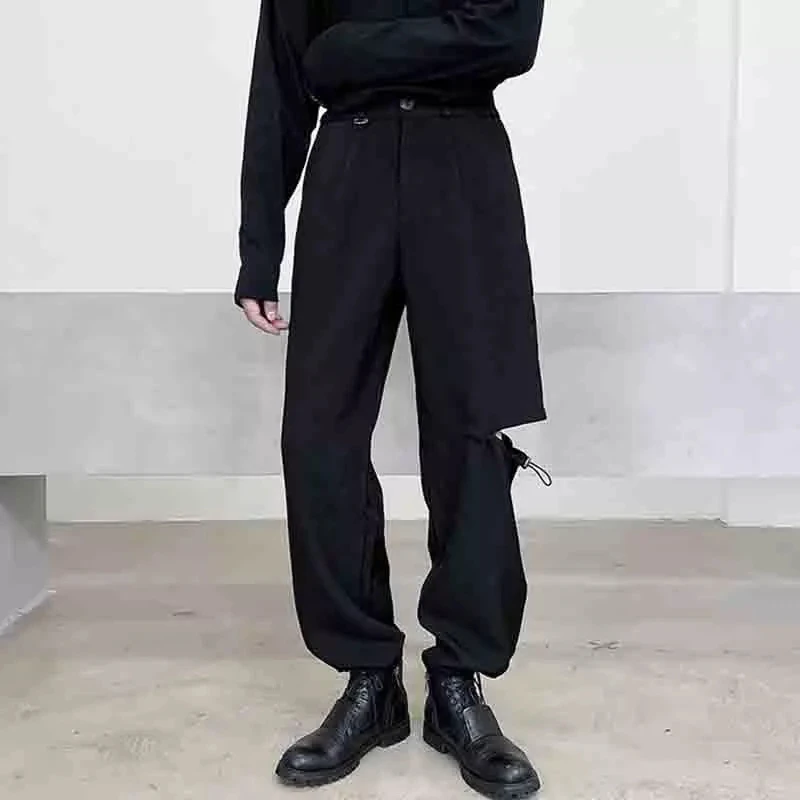 -elasticated waist, adjustable draw cord at leg hemmings and left leg opening