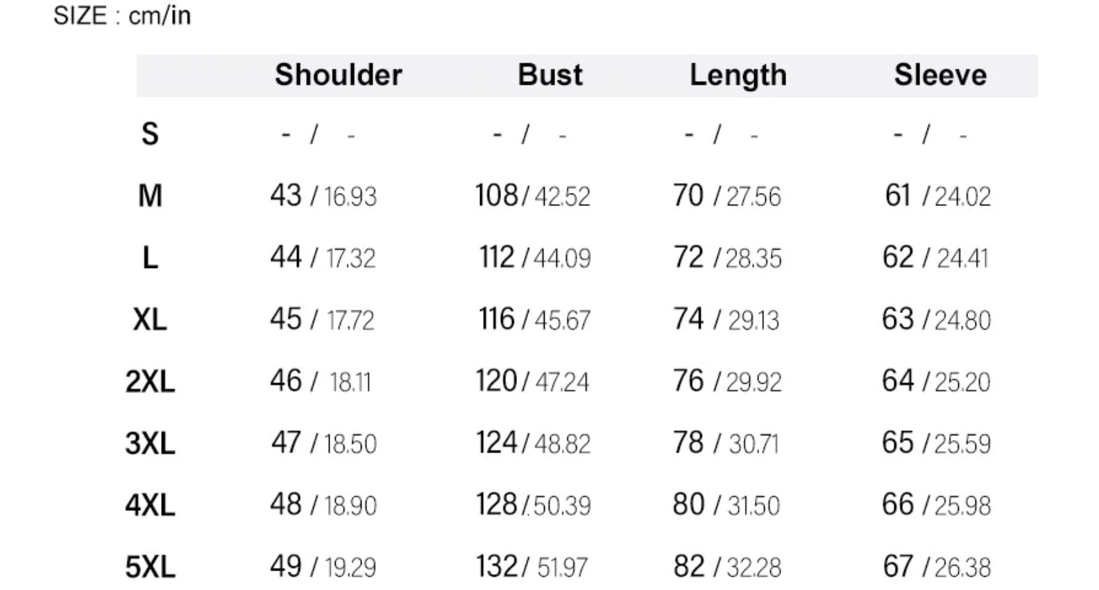 - Size: 5XL 4XL ML XL 2XL 3XL