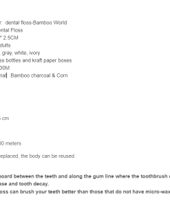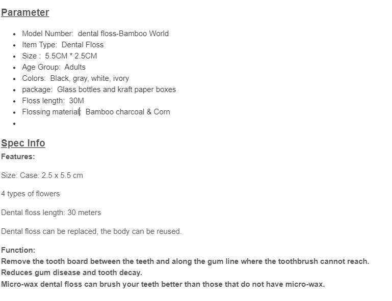 • Flossing material:  Black :  Bamboo charcoal &  White : Corn PLA filament   (a poly-lactic acid made from corn)
