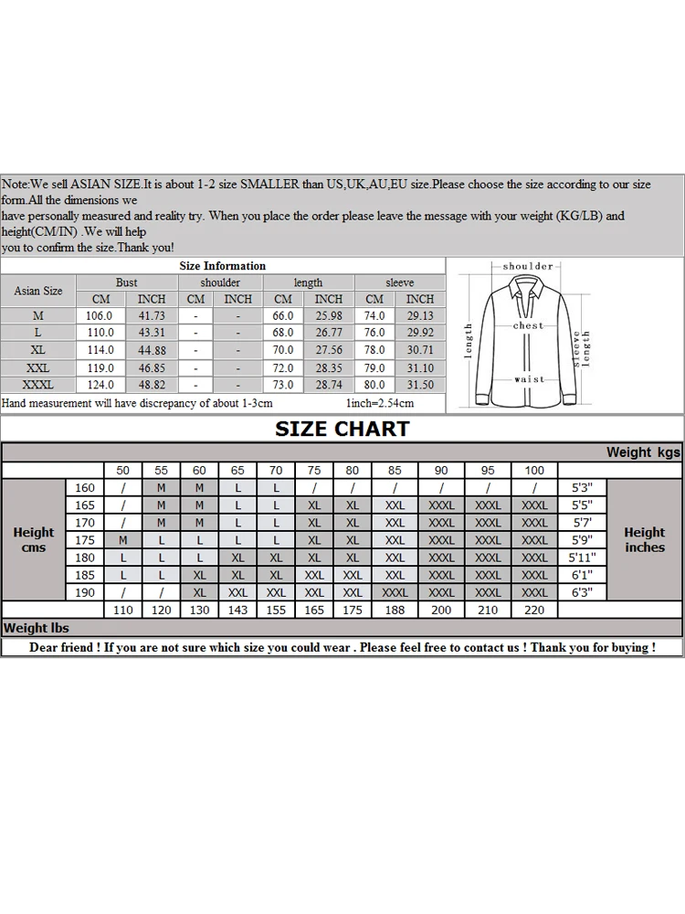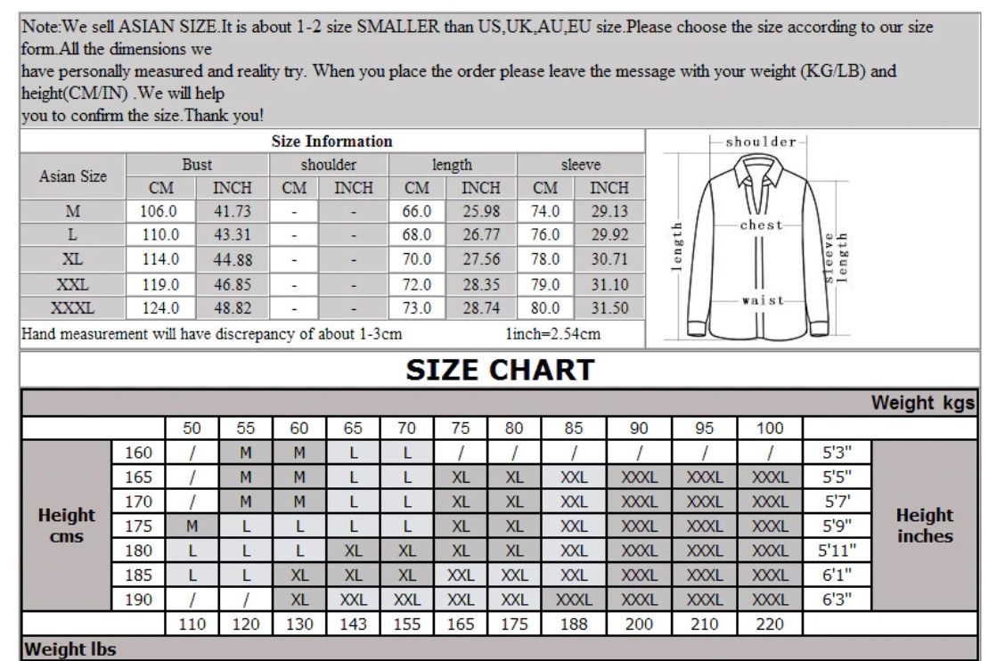 | Euro vs Asian Size | Asian Size is about 3 sizes smaller than US / EU e.g. if you are American size M => should then choose Asian size XXL or vice versa., When measuring by hands, differences within 3 cm might happen (1 inch = 2.54 cm). |