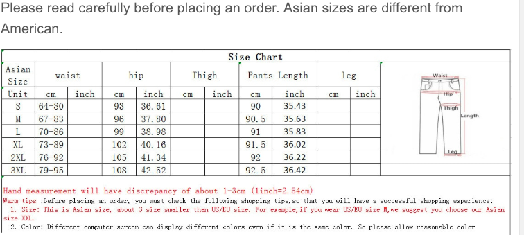 | Euro vs Asian Size | Asian Size is about 3 sizes smaller than US / EU e.g. if you are American size M => should then choose Asian size XXL or vice versa., When measuring by hands, differences within 3 cm might happen (1 inch = 2.54 cm). |