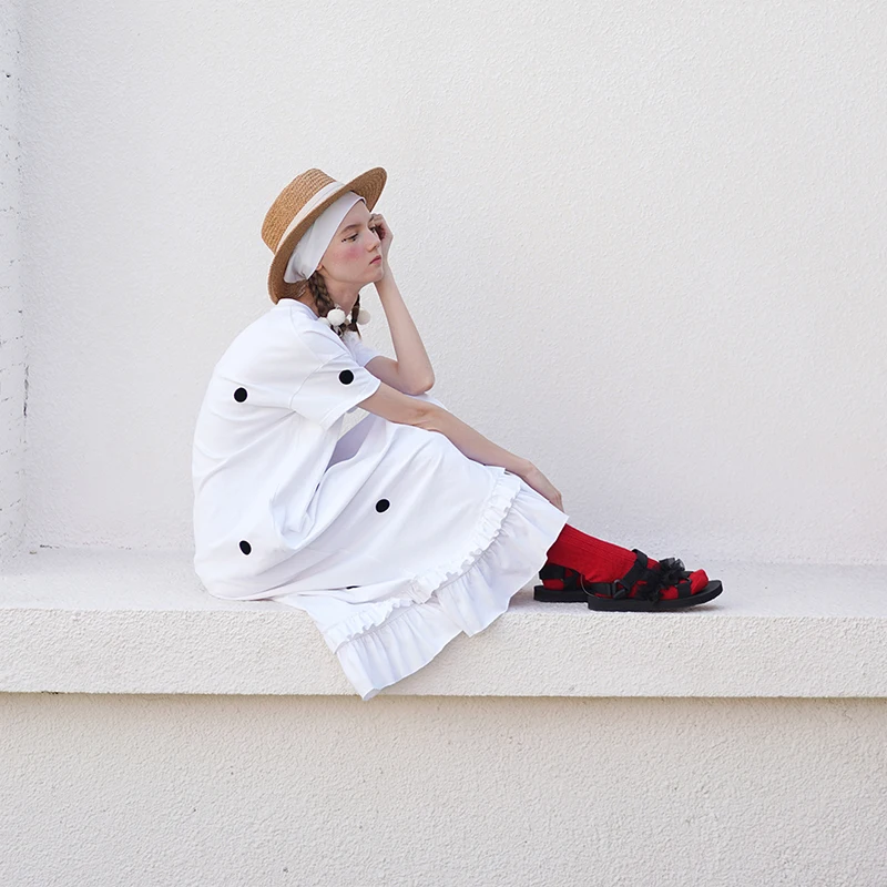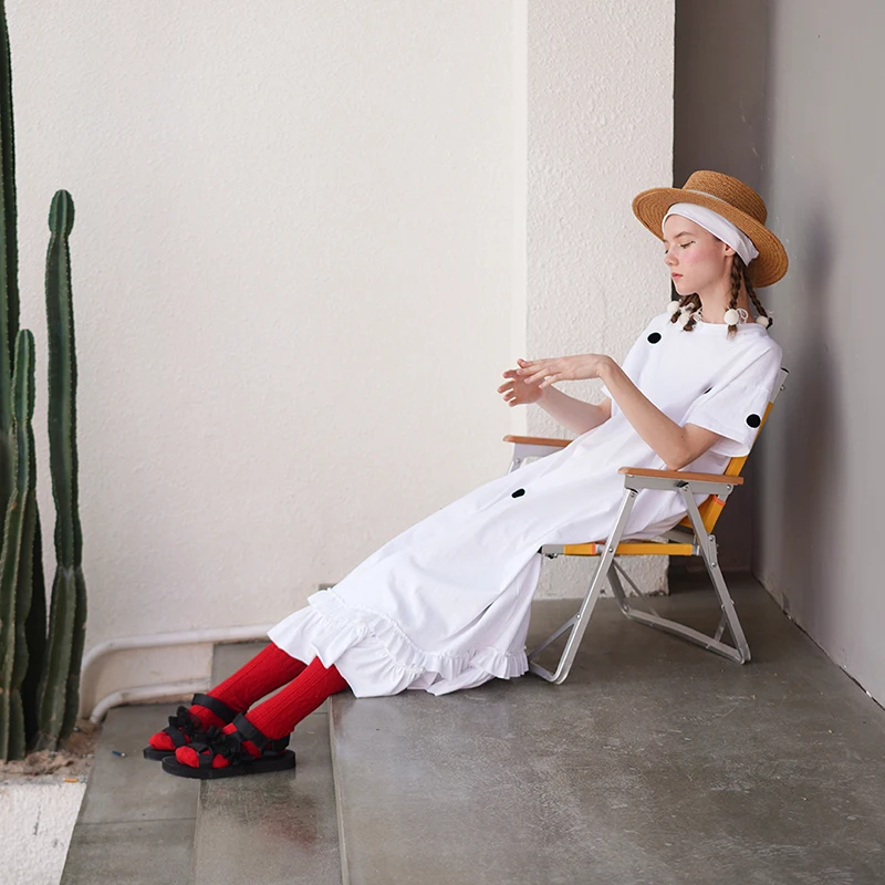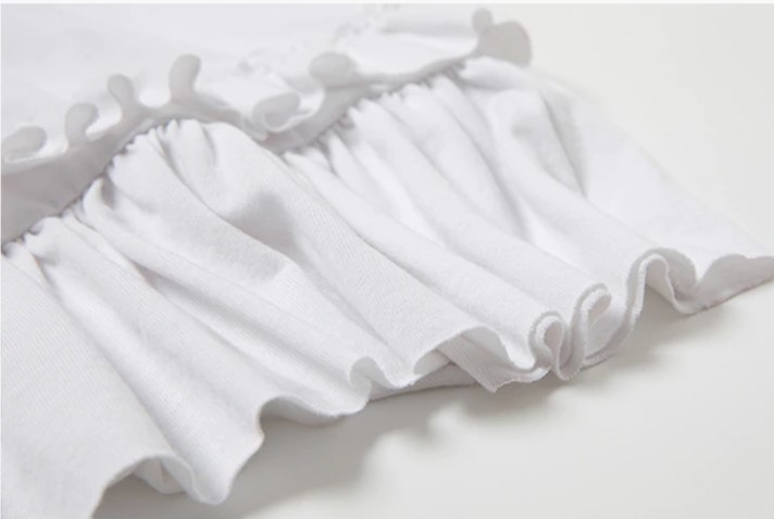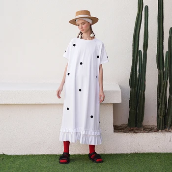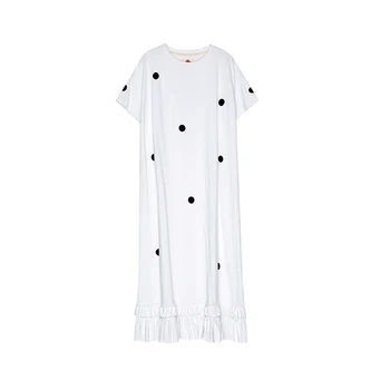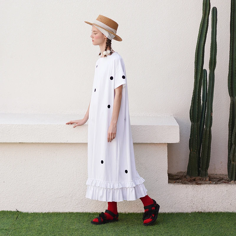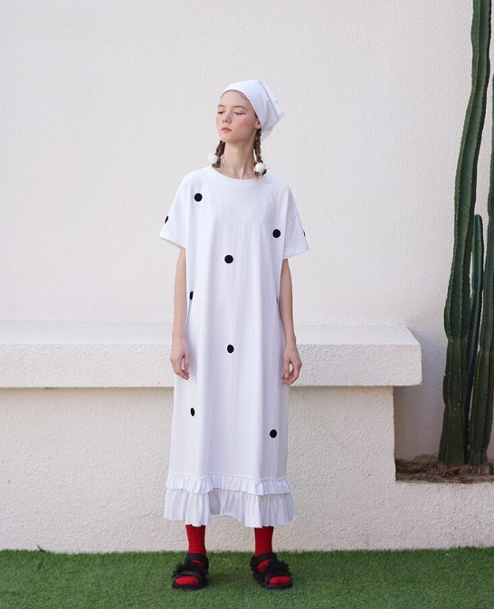 Size & Advice with loose fit, A-line cut, Short sleeves, Mid-Calf length, Ruffles patched works hemming in Cotton knitted