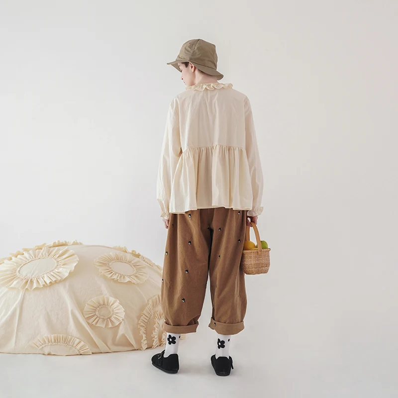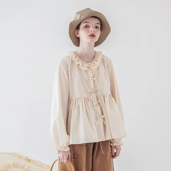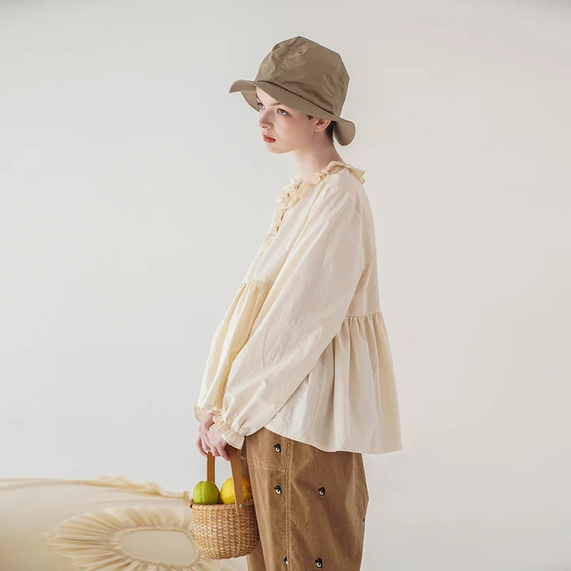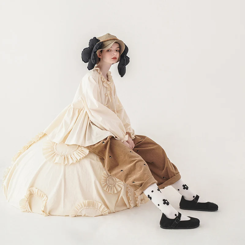 Size & Advice & Size Advice with Gathers, Frills and Ruffles along O-neck, Cuffs and Waist, Loose fit, Butterfly long sleeves, Ribbon front and in Cotton